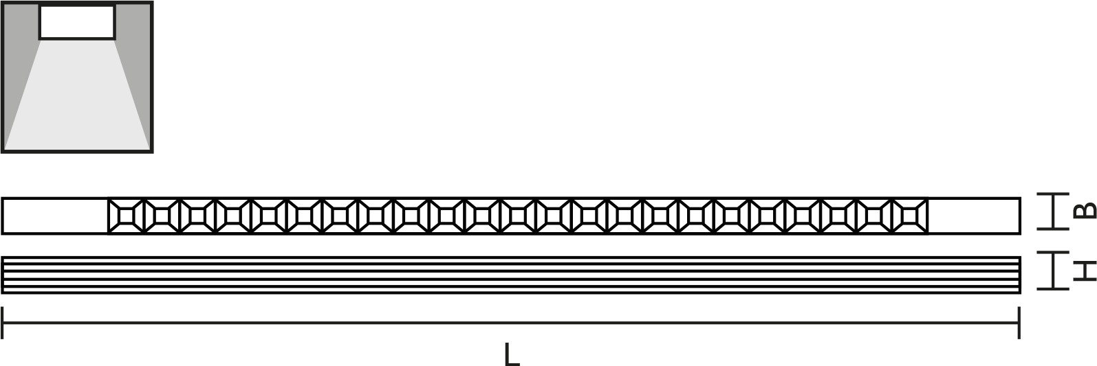 | Typ | Ausführung des Rasters | Länge | Max. Systemleistung | Bemessungslichtstrom nach IEC 62722-2-1 | Ausstrahlungswinkel | Artikel-Nr. | ||