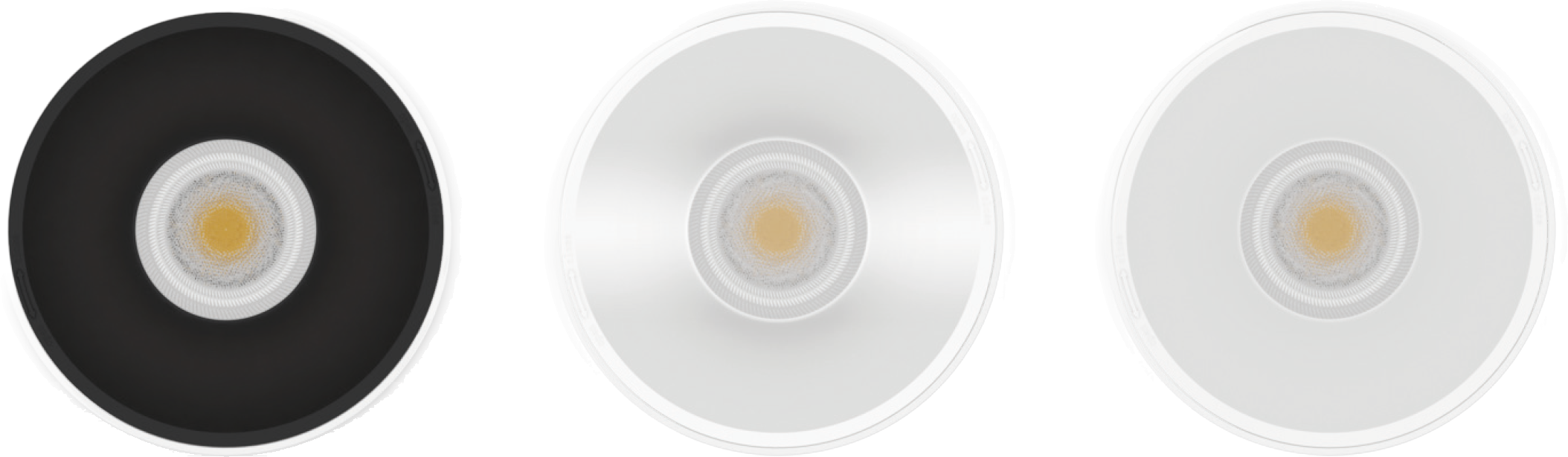 > Drei Reflektor-Varianten: schwarz, weiß oder Aluminium – passend für unterschiedliche Raumstile