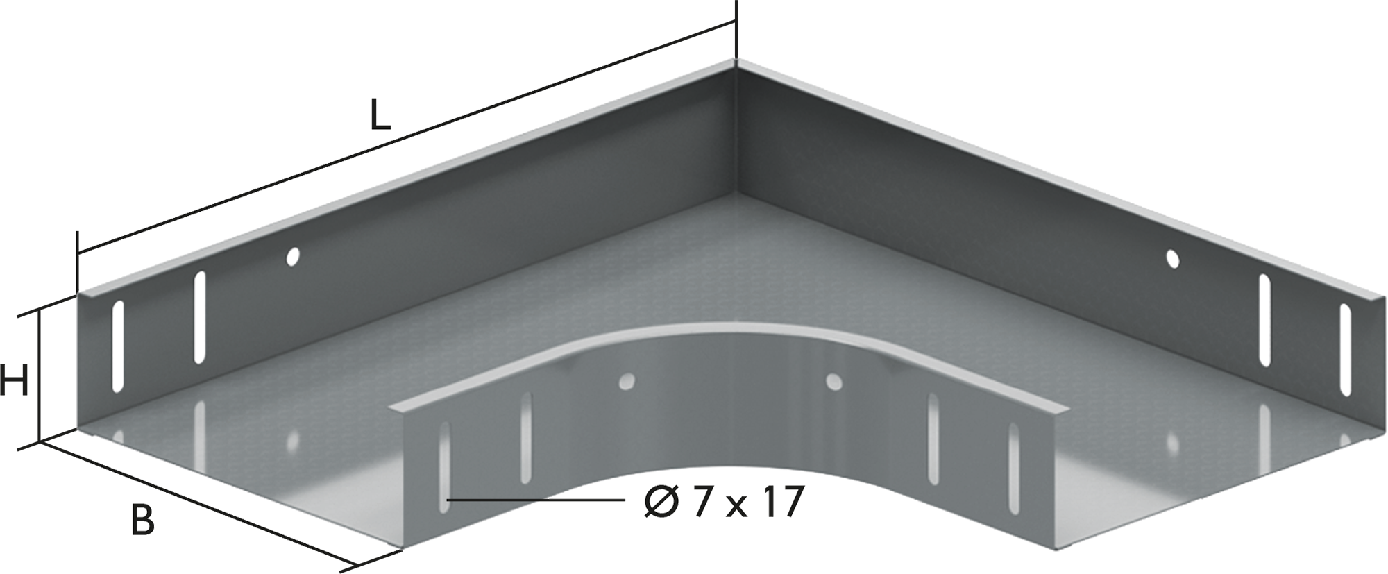 | Type Bogen KBL-B90° 600x60 mm ohne Verbinder Stahlblech, Sendzimirverzinkt | Surface protection Continuously galvanised | Suitable for cable tray height 60 mm | Suitable for cable tray width 600 mm | Product nr. 800209 | keyboard_arrow_down | |